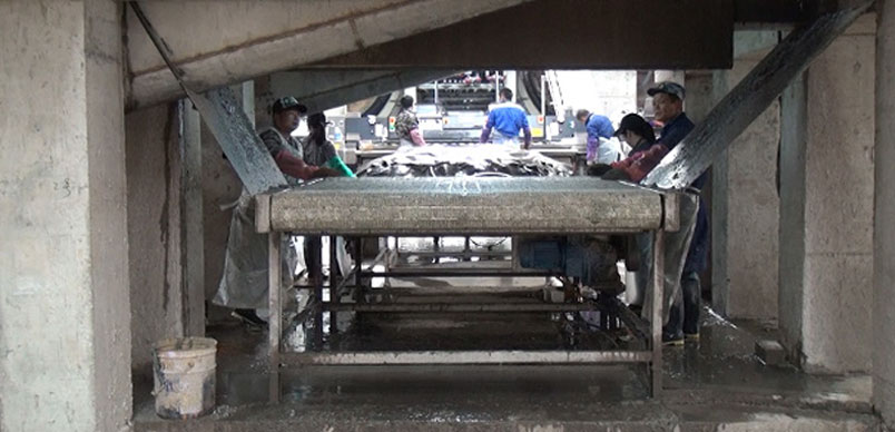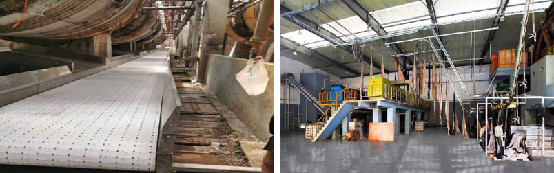 GZGCL 隨著對(duì)制革企業(yè)的要求越來(lái)越高,制革機(jī)械的設(shè)計(jì)加工要求也逐步提高。要求制革機(jī)械的加工更高效率、更低能耗,操作自動(dòng)化、智能化,安全性更高,減少操作人員數(shù)量及勞動(dòng)強(qiáng)度。實(shí)現(xiàn)制革企業(yè)自動(dòng)化、智能化、信息化升級(jí)。 我司生產(chǎn)的自動(dòng)化輸送線,有皮革輸送進(jìn)出鼓、自動(dòng)供水、化料自動(dòng)供料系統(tǒng);制革生產(chǎn)及加工自動(dòng)化控制系統(tǒng),制革生產(chǎn)過(guò)程在線檢測(cè)與控制技術(shù);制革廢液循環(huán)系統(tǒng)及配套檢測(cè)設(shè)備。 一、毛皮進(jìn)鼓線 輸送帶將皮從毛皮庫(kù)直接輸送至需要投產(chǎn)的轉(zhuǎn)鼓,可自動(dòng)稱重,到達(dá)指定重量后轉(zhuǎn)鼓鼓門關(guān)閉,輸送帶按設(shè)定的程序?qū)⑵ぽ斔椭疗渌D(zhuǎn)鼓。 二、回鮮皮自動(dòng)出鼓線 完成浸水后的皮張從轉(zhuǎn)鼓中卸出,并自動(dòng)掉落到出鼓線上,出鼓線將皮張輸送到指定地點(diǎn),用夾皮掛晾線輸送至去肉機(jī)高臺(tái),自動(dòng)掉落至去肉機(jī)進(jìn)行皮張去肉。 三、入鼓膨脹和肉渣輸送線 去肉后的皮張自動(dòng)滑落至膨脹入鼓線上 (由于各制革廠工藝的不同,有些制革廠在此再加一個(gè)自動(dòng)輸送平臺(tái)用于修邊),輸送線自動(dòng)完成計(jì)重后送入到指定轉(zhuǎn)鼓浸灰膨脹;從皮張上刮下來(lái)的肉渣由肉渣輸送線送至肉渣壓水機(jī)。 四、灰皮出鼓線 浸灰膨脹完成后轉(zhuǎn)鼓將皮張倒入膨脹出鼓線上,出鼓線將皮輸送至指定區(qū)域,用夾皮掛晾線將皮輸送至高臺(tái)去肉機(jī)的上部,自動(dòng)掉落在去肉機(jī)的供料機(jī)構(gòu)中進(jìn)行去肉。肉渣輸送線將肉渣輸送至肉渣壓水機(jī)。 五、輸送平臺(tái) 灰皮去肉后自動(dòng)掉落到輸送平臺(tái)上,操作工完成對(duì)皮張的修邊和碼皮,碼整齊的灰皮被輸送至剖層機(jī)的工作臺(tái)前,操作工進(jìn)行剖層皮革。 六、入鼓鞣制線 完成剖層后的頭層皮由自動(dòng)拉皮裝置從剖層機(jī)拉出掉落至鞣制入鼓線上,輸送線對(duì)皮張自動(dòng)計(jì)重并送往指定的轉(zhuǎn)鼓進(jìn)行鞣制,到達(dá)指定重量后轉(zhuǎn)鼓鼓門關(guān)閉,輸送帶按設(shè)定的程序?qū)⑵ぽ斔椭疗渌D(zhuǎn)鼓。 七、二層皮輸送線 經(jīng)剖層后的二層皮自動(dòng)掉落至二層皮輸送線上,根據(jù)客戶的不同要求可以輸送至指定的區(qū)域。 制革自動(dòng)化生產(chǎn)流水線是具有鮮明個(gè)性化的產(chǎn)品,要根據(jù)各公司的產(chǎn) 量、工藝、場(chǎng)地、需求等等來(lái)總體規(guī)劃進(jìn)行設(shè)計(jì),根據(jù)本公司多年來(lái)的實(shí)踐新建制革廠時(shí)一定要盡早納入,統(tǒng)籌考慮后就可做得非常理想。受去肉與剖層機(jī)生產(chǎn)效率的限制一條流水線以每天產(chǎn)量在2000張左右為宜,制革水廠一條流水線有10多名熟練工人操作即可滿足,人力資源節(jié)省三分之一。 傳送帶的主要技術(shù)參數(shù)及配置 1、帶子輸送速度為24m/min。 |